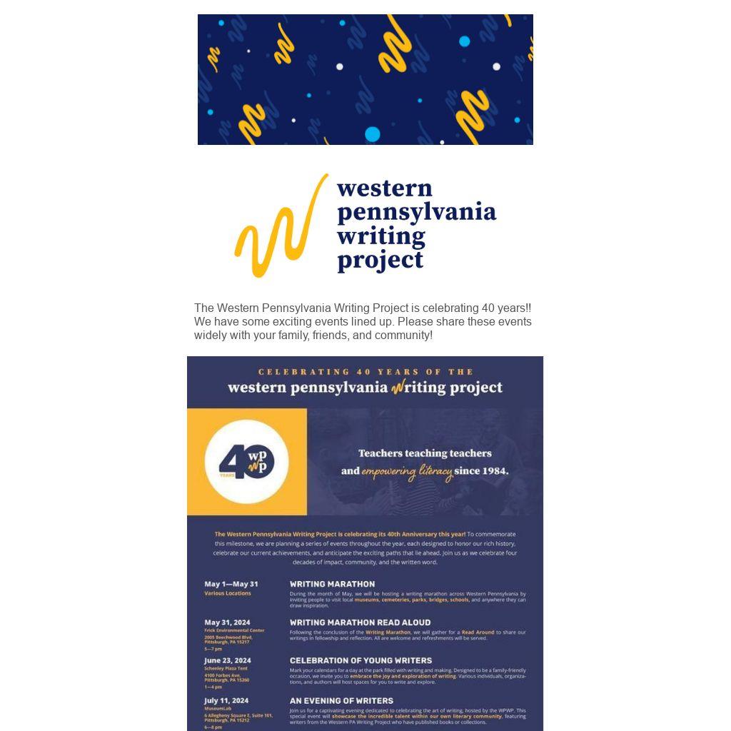 The Western Pennsylvania Writing Project is celebrating 40 years!! We have some exciting events lined up. Please share these events widely with your family, friends, and community!