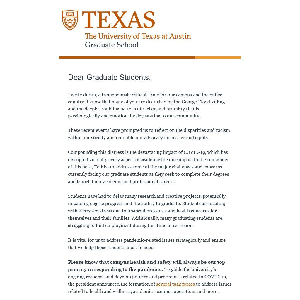 I will be sharing more information soon on findings and plans from the various working groups involved the university’s COVID-19 response. Additionally, the Graduate School and the Graduate Student Assembly (GSA) are conducting a survey of graduate students on COVID-19 issues to identify needed resources. Students in graduate programs overseen by the Graduate School have been solicited to participate. The survey results will be made available to the campus community this summer.