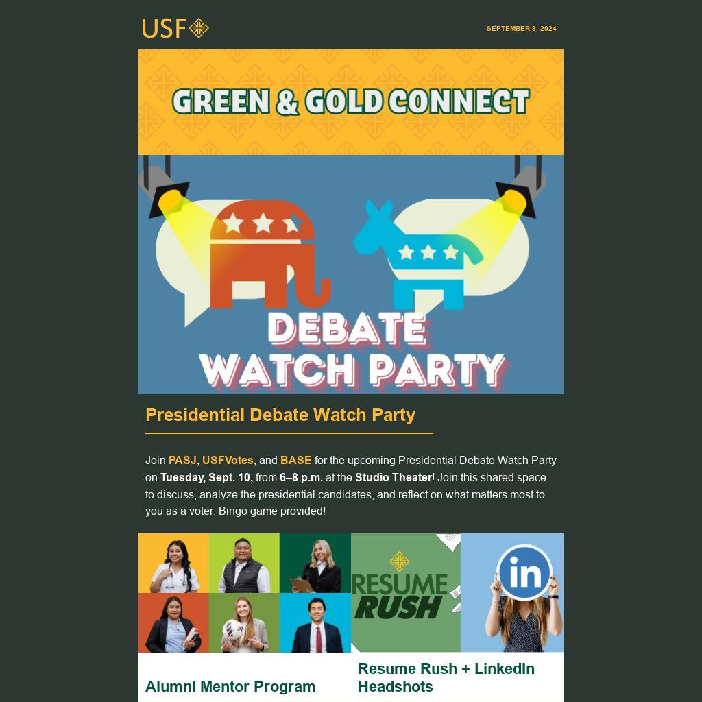 Join PASJ, USFVotes, and BASE for the upcoming Presidential Debate Watch Party on Tuesday, Sept. 10, from 6–8 p.m. at the Studio Theater! Join this shared space to discuss, analyze the presidential candidates, and reflect on what matters most to you as a voter. Bingo game provided!