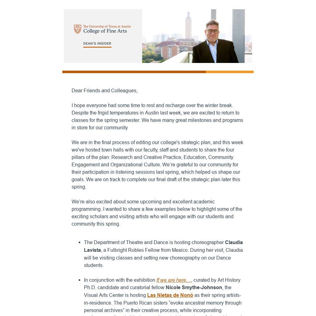 We have a busy spring ahead of us, and we’re excited about what’s ahead for the College of Fine Arts as we plan for our future.