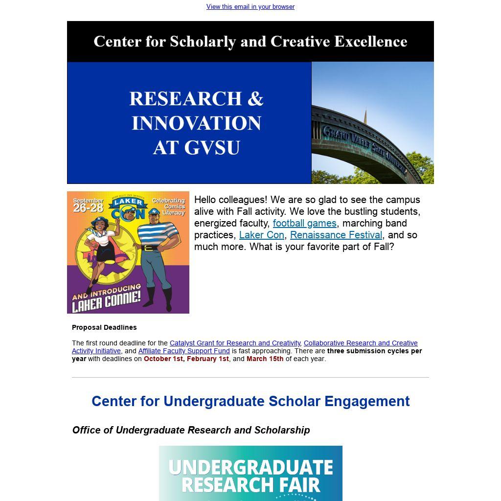 Hello colleagues! We are so glad to see the campus alive with Fall activity. We love the bustling students, energized faculty, football games, marching band practices, Laker Con, Renaissance Festival, and so much more. What is your favorite part of Fall?