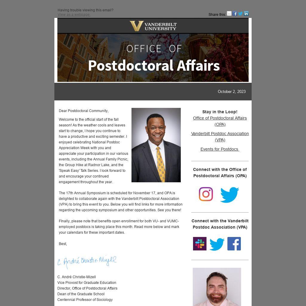 - Welcome Remarks from André Christie-Mizell, Vice Provost for Graduate Education, Dean of the Graduate School, and Director of the Office of Postdoctoral Affairs at Vanderbilt University