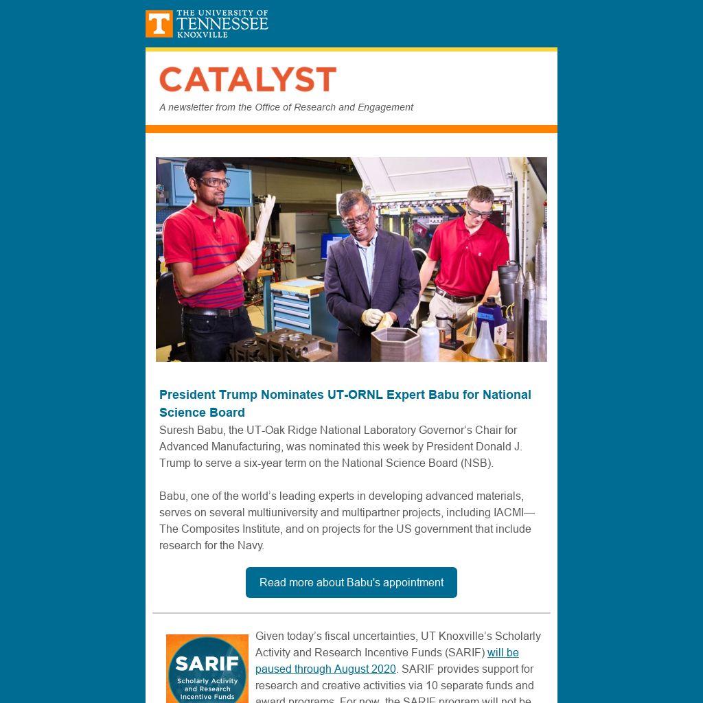 Suresh Babu, the UT-Oak Ridge National Laboratory Governor’s Chair for Advanced Manufacturing, was nominated this week by President Donald J. Trump to serve a six-year term on the National Science Board (NSB).