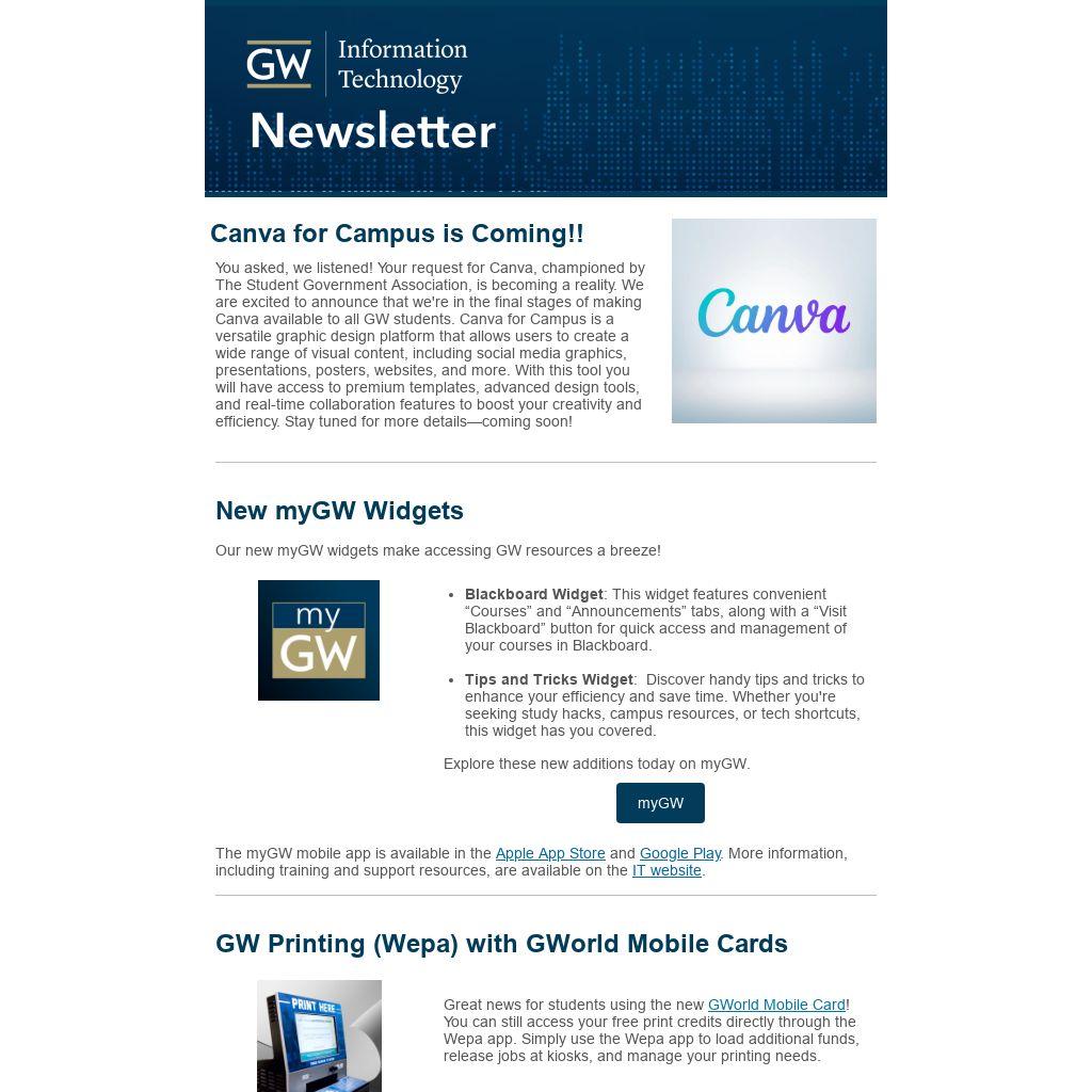You asked, we listened! Your request for Canva, championed by The Student Government Association, is becoming a reality. We are excited to announce that we're in the final stages of making Canva available to all GW students. Canva for Campus is a versatile graphic design platform that allows users to create a wide range of visual content, including social media graphics, presentations, posters, websites, and more. With this tool you will have access to premium templates, advanced design tools, and real-time collaboration features to boost your creativity and efficiency. Stay tuned for more details—coming soon!