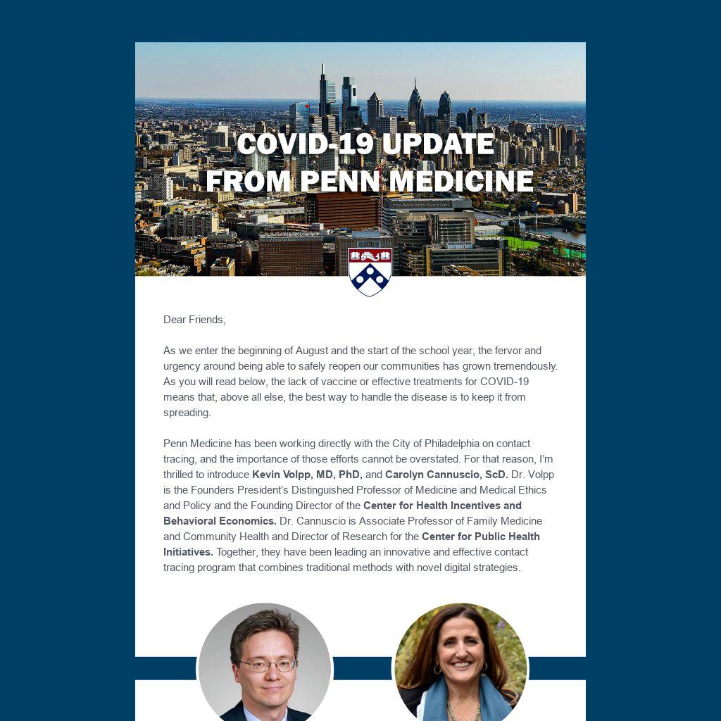 Dear Friends, As we enter the beginning of August and the start of the school year, the fervor and urgency around being able to safely reopen our communities has grown tremendously. As you will read below, the lack of vaccine or effective treatments for COVID-19 means that, above all else, the best way to handle the disease is to keep it from spreading. Penn Medicine has been working directly with the City of Philadelphia on contact tracing, and the importance of those efforts cannot be overstated. For that reason, I’m thrilled to introduce Kevin Volpp, MD, PhD, and Carolyn Cannuscio, ScD. Dr. Volpp is the Founders President’s Distinguished Professor of Medicine and Medical Ethics and Policy and the Founding Director of the Center for Health Incentives and Behavioral Economics. Dr. Cannuscio is Associate Professor of Family Medicine and Community Health and Director of Research for the Center for Public Health Initiatives. Together, they have been leading an innovative and effective contact tracing program that combines traditional methods with novel digital strategies.