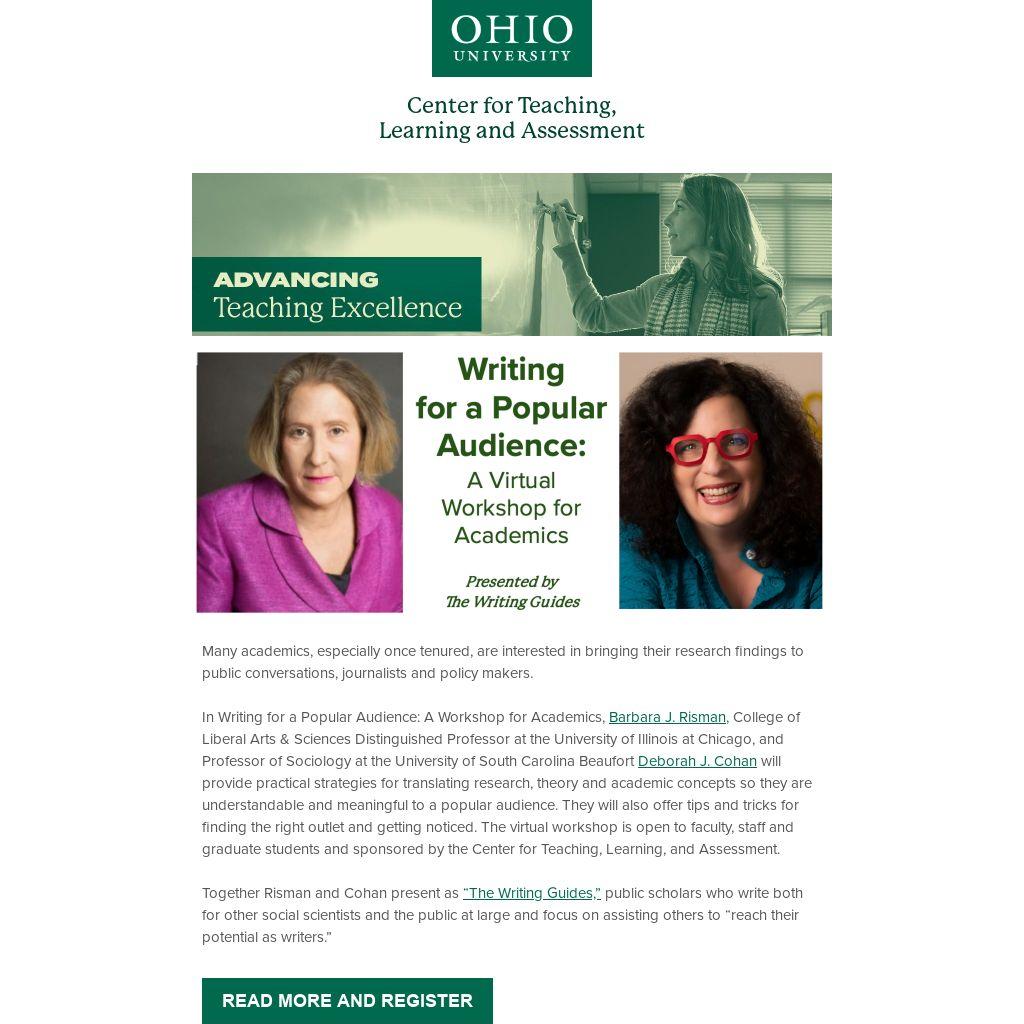 In Writing for a Popular Audience: A Workshop for Academics, Barbara J. Risman, College of Liberal Arts & Sciences Distinguished Professor at the University of Illinois at Chicago, and Professor of Sociology at the University of South Carolina Beaufort Deborah J. Cohan will provide practical strategies for translating research, theory and academic concepts so they are understandable and meaningful to a popular audience. They will also offer tips and tricks for finding the right outlet and getting noticed. The virtual workshop is open to faculty, staff and graduate students and sponsored by the Center for Teaching, Learning, and Assessment.