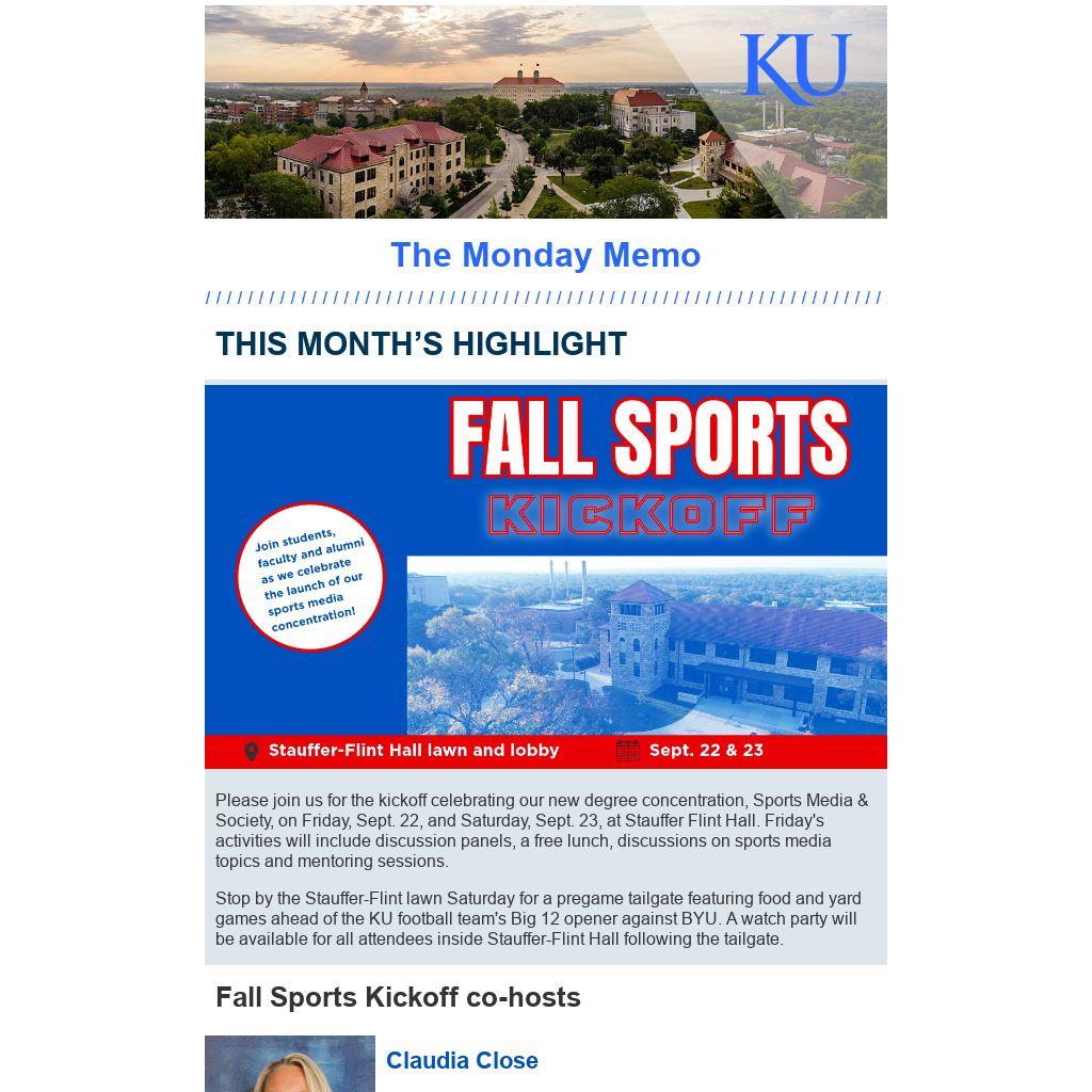 - Sept. 13: KU PRSSA Chapter meeting, 6 p.m., Stauffer-Flint Hall room 303