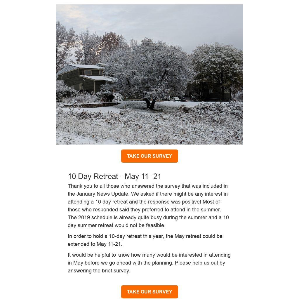 Thank you to all those who answered the survey that was included in the January News Update. We asked if there might be any interest in attending a 10 day retreat and the response was positive! Most of those who responded said they preferred to attend in the summer. The 2019 schedule is already quite busy during the summer and a 10 day summer retreat would not be feasible.