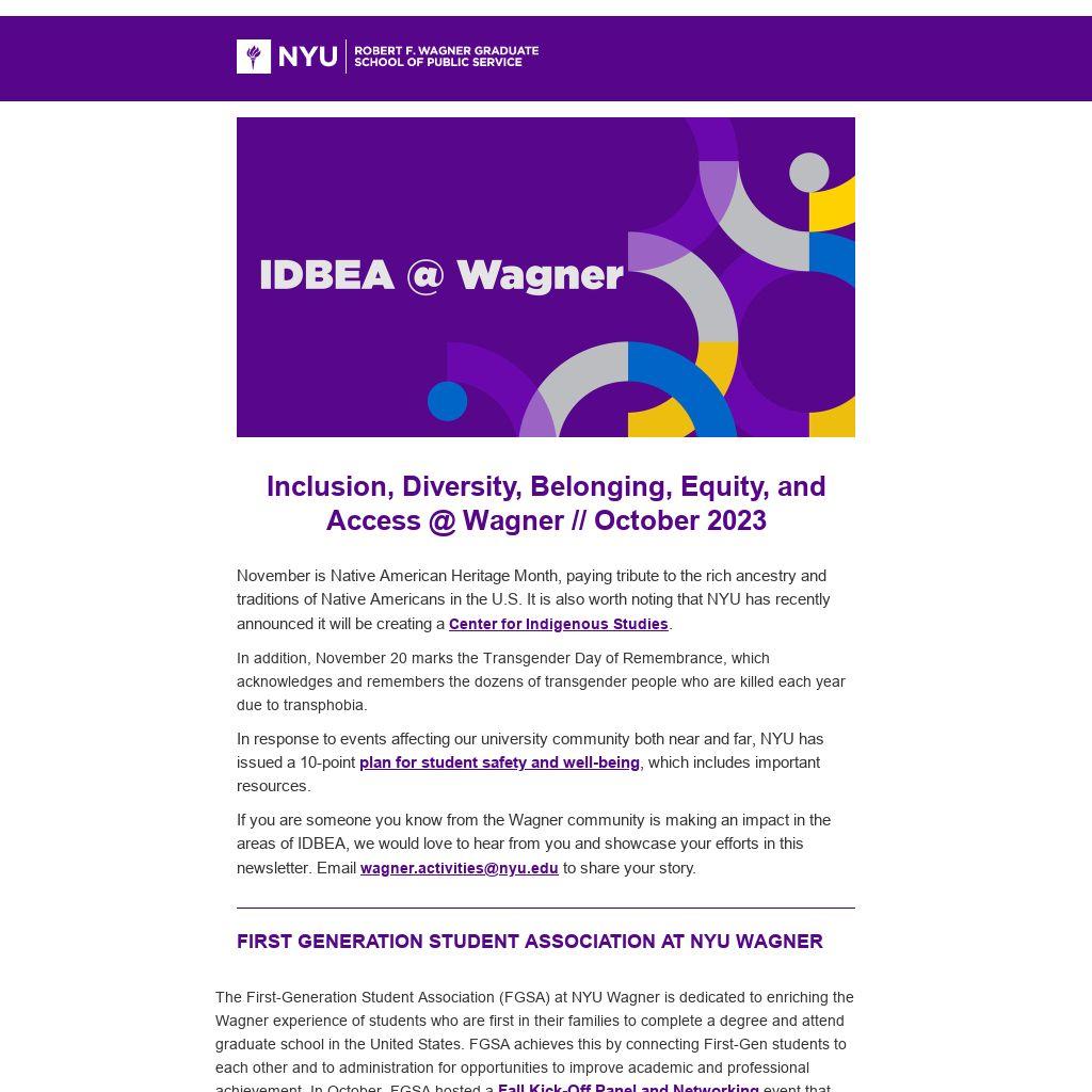 Write to us at wagner.activities@nyu.edu with suggestions for this newsletter as well as any questions or concerns about inclusion, diversity, belonging, equity, and access (IDBEA) at NYU Wagner.