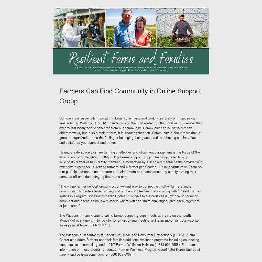 The Wisconsin Farm Center’s online farmer support groups meets at 8 p.m. on the fourth Monday of every month. To register for an upcoming meeting and learn more, visit our website or register at https://bit.ly/2KI2ftd.
