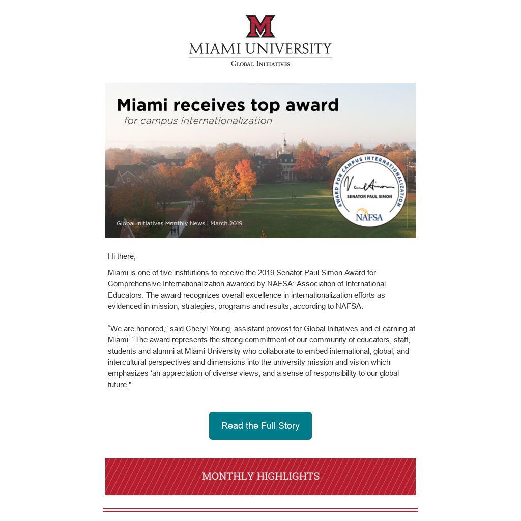 Miami is one of five institutions to receive the 2019 Senator Paul Simon Award for Comprehensive Internationalization awarded by NAFSA: Association of International Educators. The award recognizes overall excellence in internationalization efforts as evidenced in mission, strategies, programs and results, according to NAFSA.