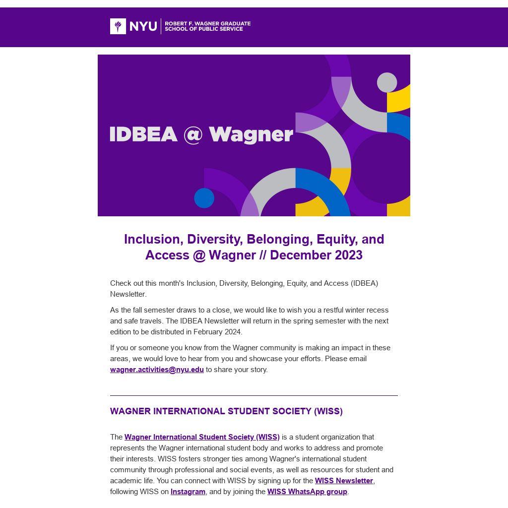 Questions? Let us know if you have suggestions for this newsletter as well as any questions or concerns about inclusion, diversity, belonging, equity, and access (IDBEA) at Wagner by writing to us at wagner.activities@nyu.edu.