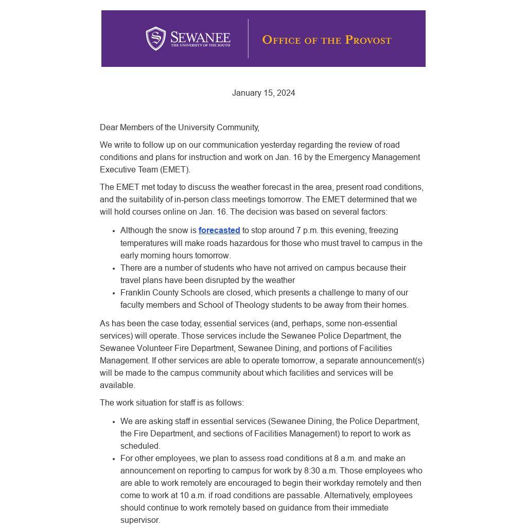 As has been the case today, essential services (and, perhaps, some non-essential services) will operate. Those services include the Sewanee Police Department, the Sewanee Volunteer Fire Department, Sewanee Dining, and portions of Facilities Management. If other services are able to operate tomorrow, a separate announcement(s) will be made to the campus community about which facilities and services will be available.