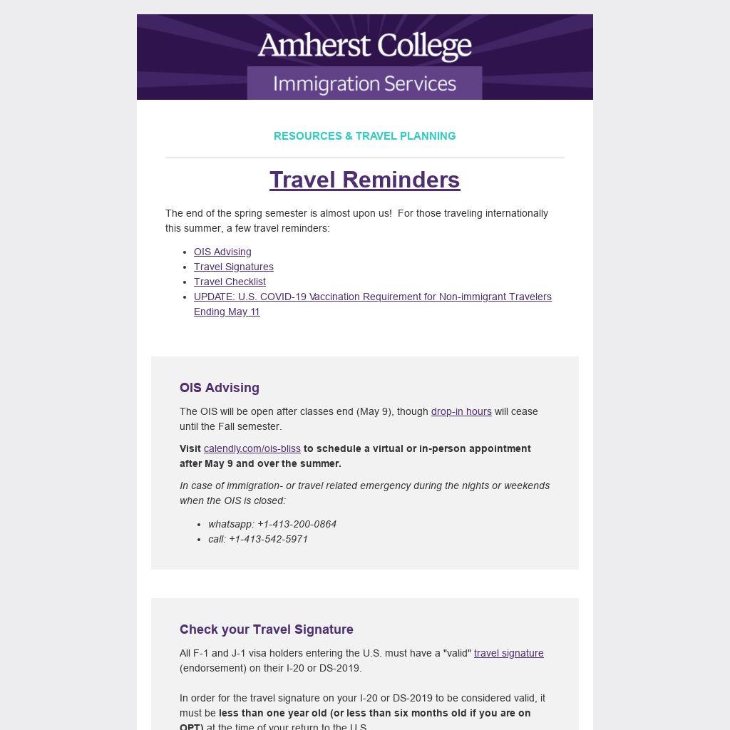 The end of the spring semester is almost upon us!  For those traveling internationally this summer, a few travel reminders: