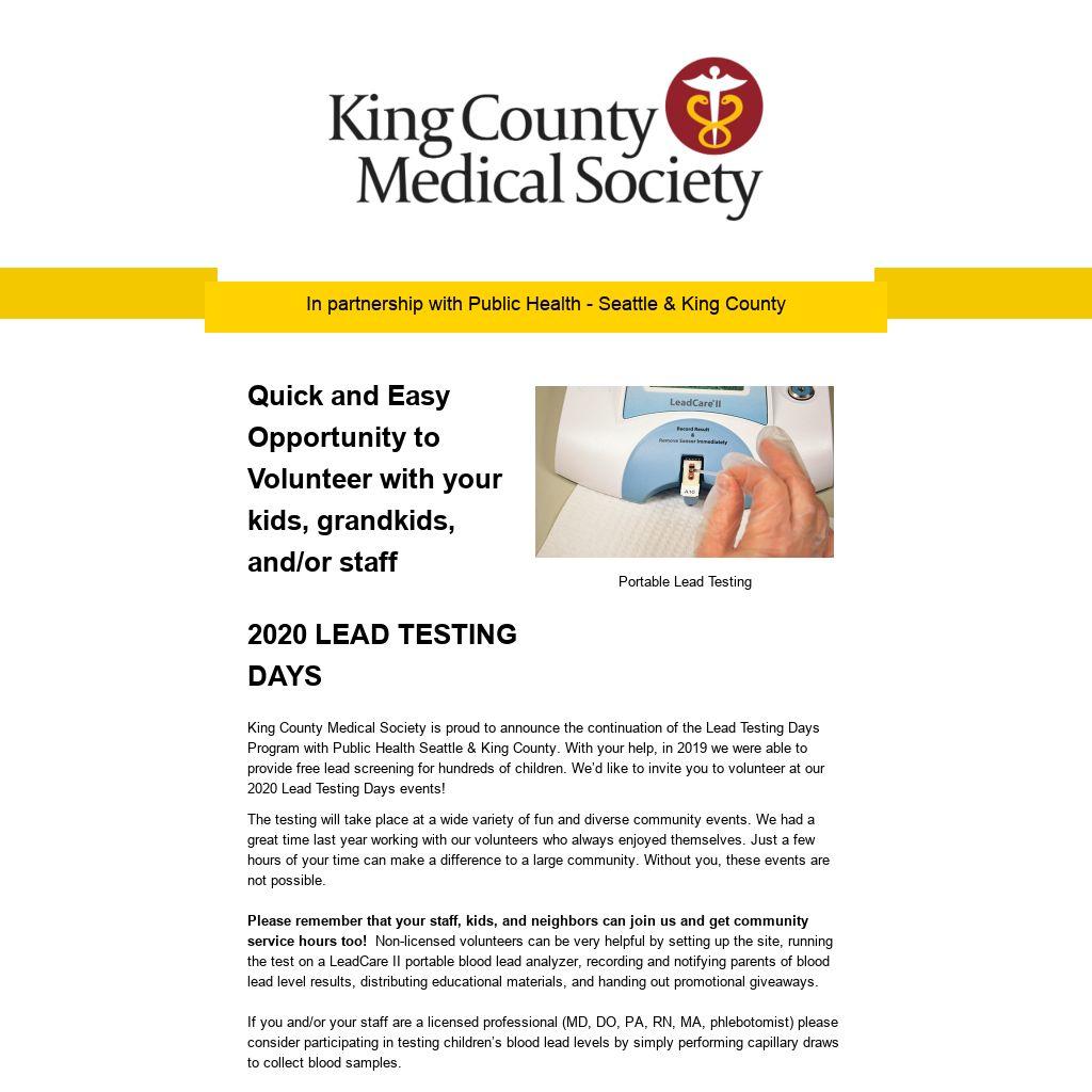 King County Medical Society is proud to announce the continuation of the Lead Testing Days Program with Public Health Seattle & King County. With your help, in 2019 we were able to provide free lead screening for hundreds of children. We’d like to invite you to volunteer at our 2020 Lead Testing Days events!