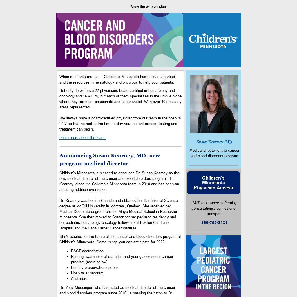 Children’s Minnesota is pleased to announce Dr. Susan Kearney as the new medical director of the cancer and blood disorders program. Dr. Kearney joined the Children’s Minnesota team in 2010 and has been an amazing addition ever since.