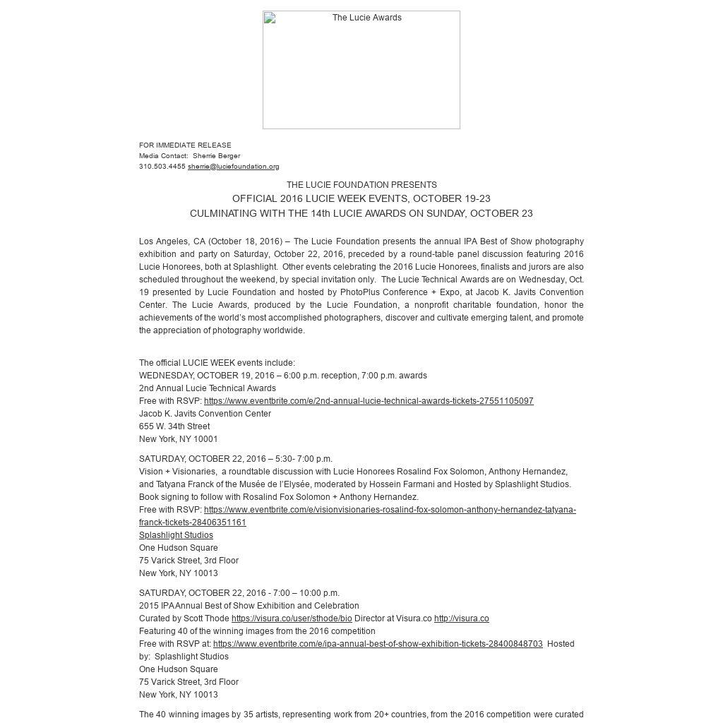Following the weekend events, The Lucie Awards gala will be held on Sunday, October 23, at 7pm, with arrivals at 6pm, at Zankel Hall at Carnegie Hall in New York City. Honorees, industry luminaries and top winners from the 2016 IPA competition will be recognized. Tickets are on sale at www.lucies.org About Lucie Foundation - Lucie Foundation's mission is to honor master photographers, discover and cultivate emerging talent and promote photography appreciation worldwide. The Lucie Awards ceremony is held annually to celebrate the outstanding achievements of the international photography community, recognizing those whose life's work deserves the highest acclaim. This is also where the Foundation's sister enterprise, the International Photography Awards (IPA) competition, announces the winners of the Photographer of the Year, the Discovery of the Year, the Deeper Perspective Photographer of the Year, and the Moving Image Photographer of the Year awards. Cash prizes and statues are awarded. The Foundation presents year-round programming to support high school students through SNAPSHOP! The Foundation also offers financial funding through the Lucie Scholarship Programs in support of both emerging and professional photographers. MOPLA (Month of Photography LA), has become the west coast destination for a unique month of distinctive programming for photographers and those who appreciate the craft. The Lucie Foundation is a 501(c)3 non-profit charitable foundation. www.luciefoundation.org