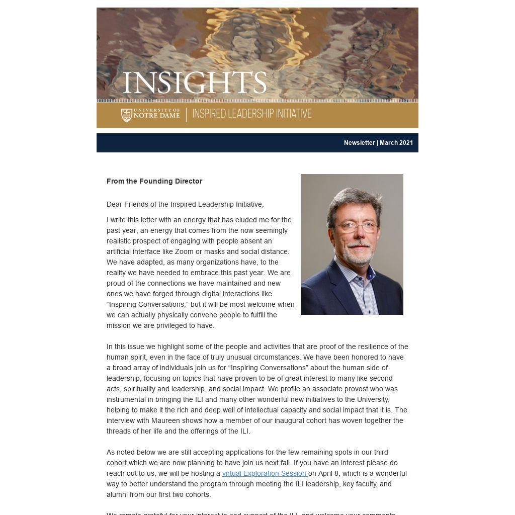 In this issue we highlight some of the people and activities that are proof of the resilience of the human spirit, even in the face of truly unusual circumstances. We have been honored to have a broad array of individuals join us for “Inspiring Conversations” about the human side of leadership, focusing on topics that have proven to be of great interest to many like second acts, spirituality and leadership, and social impact. We profile an associate provost who was instrumental in bringing the ILI and many other wonderful new initiatives to the University, helping to make it the rich and deep well of intellectual capacity and social impact that it is. The interview with Maureen shows how a member of our inaugural cohort has woven together the threads of her life and the offerings of the ILI.