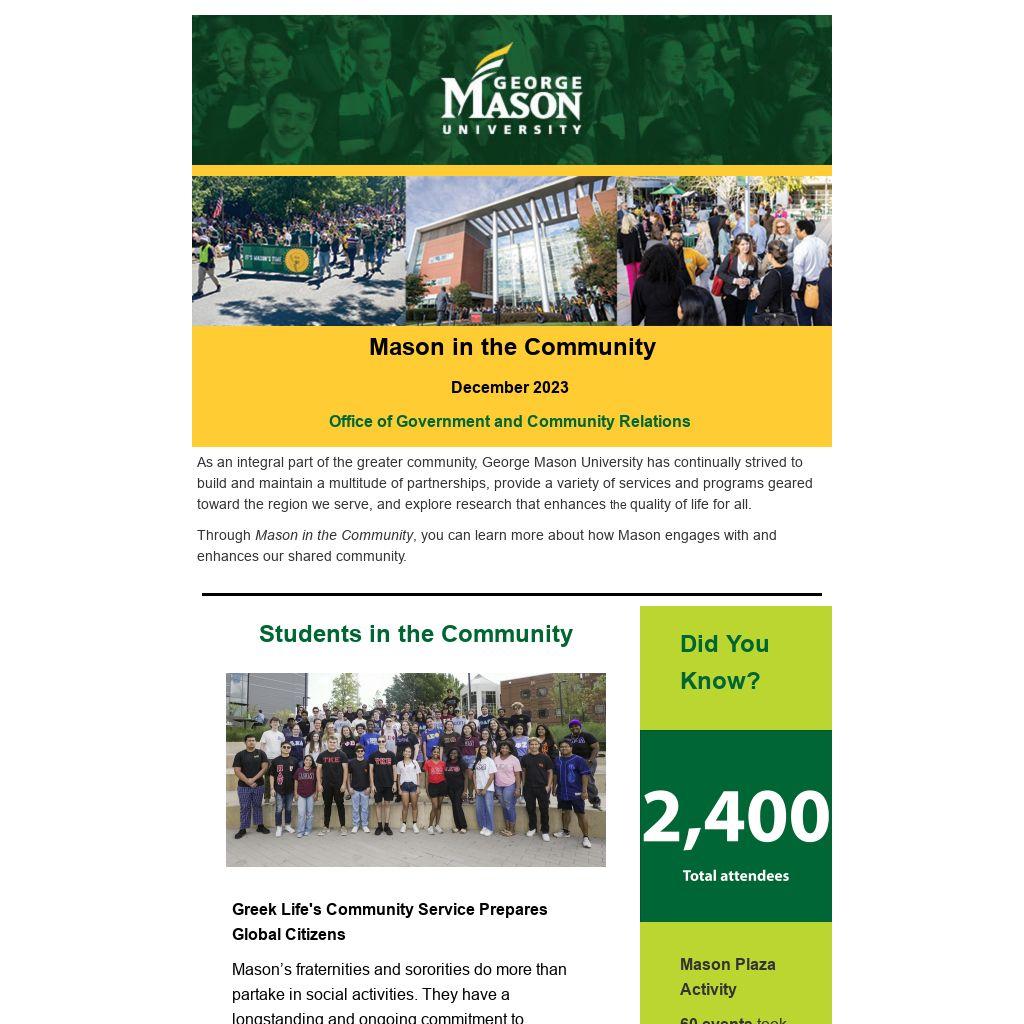 Since joining Mason, she’s worked in Richmond on Virginia’s Capitol Square. During the 2023 General Assembly session, she worked to secure increases in Mason’s operating budget, student financial aid, increases for faculty and staff salaries, critical deferred maintenance projects, and investments in our healthcare workforce programs.