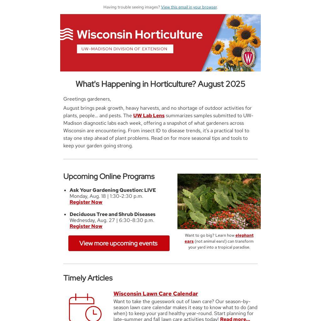 August brings peak growth, heavy harvests, and no shortage of outdoor activities for plants, people… and pests. The UW Lab Lens summarizes samples submitted to UW-Madison diagnostic labs each week, offering a snapshot of what gardeners across Wisconsin are encountering. From insect ID to disease trends, it’s a practical tool to stay one step ahead of plant problems. Read on for more seasonal tips and tools to keep your garden going strong.
