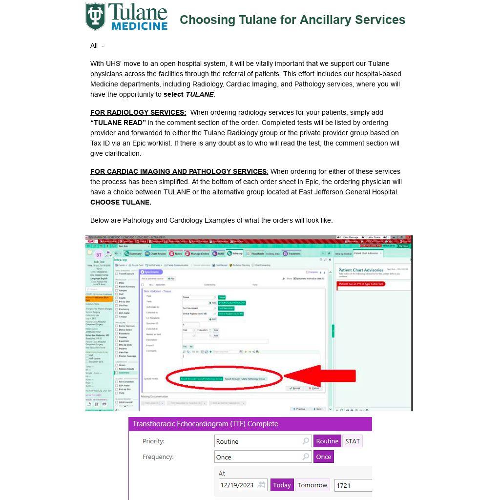 FOR CARDIAC IMAGING AND PATHOLOGY SERVICES: When ordering for either of these services the process has been simplified. At the bottom of each order sheet in Epic, the ordering physician will have a choice between TULANE or the alternative group located at East Jefferson General Hospital. CHOOSE TULANE.