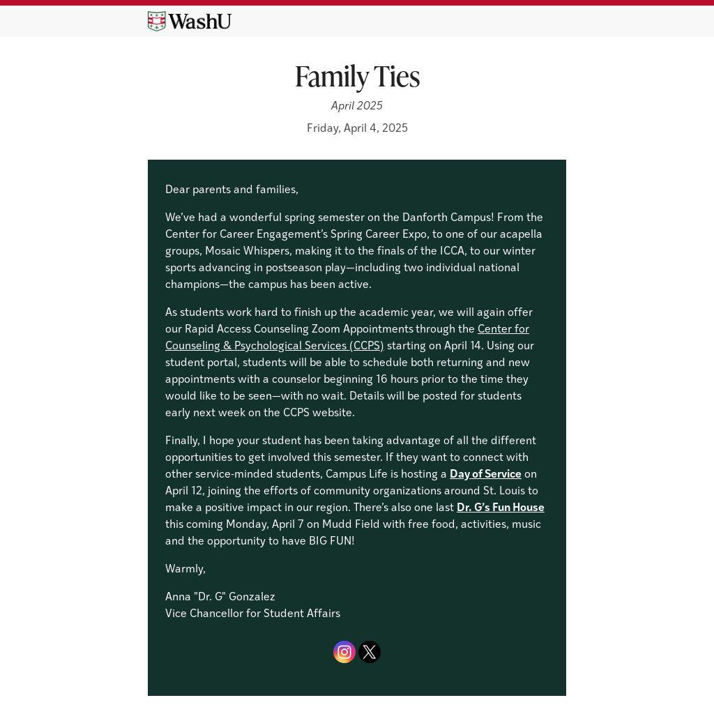 Finally, I hope your student has been taking advantage of all the different opportunities to get involved this semester. If they want to connect with other service-minded students, Campus Life is hosting a Day of Service on April 12, joining the efforts of community organizations around St. Louis to make a positive impact in our region. There’s also one last Dr. G’s Fun House this coming Monday, April 7 on Mudd Field with free food, activities, music and the opportunity to have BIG FUN!