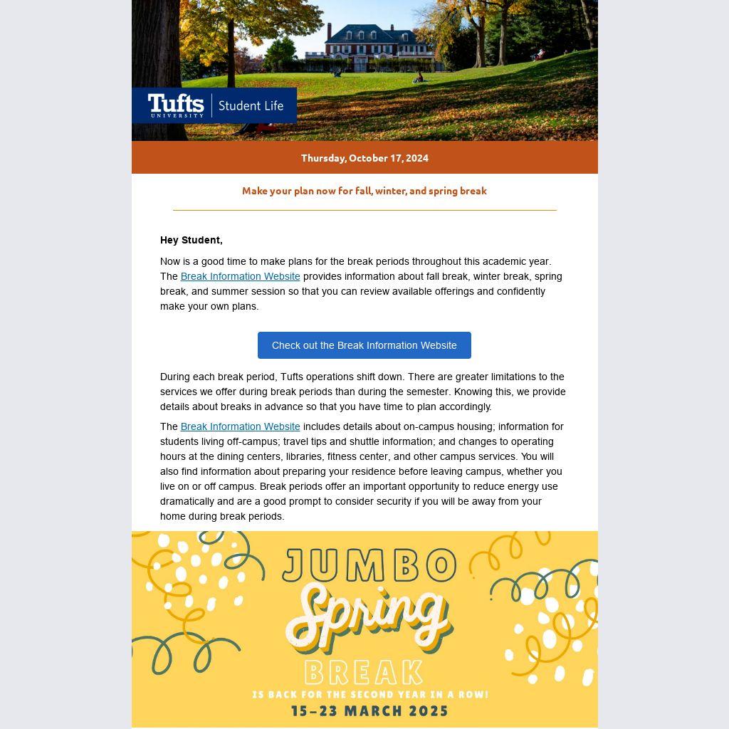 During each break period, Tufts operations shift down. There are greater limitations to the services we offer during break periods than during the semester. Knowing this, we provide details about breaks in advance so that you have time to plan accordingly.