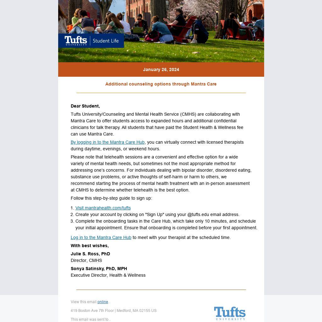 Tufts University/Counseling and Mental Health Service (CMHS) are collaborating with Mantra Care to offer students access to expanded hours and additional confidential clinicians for talk therapy. All students that have paid the Student Health & Wellness fee can use Mantra Care.