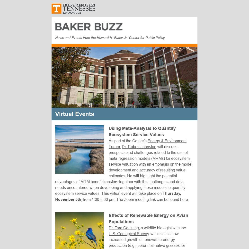The Center is a home for civic engagement for students in all disciplines and at all levels. Through programs, events and lectures, and helpful faculty and staff, the Center aims to engage the community on the topics of Global Security, Leadership & Governance, and Energy & Environment. Learn more at bakercenter.utk.edu.