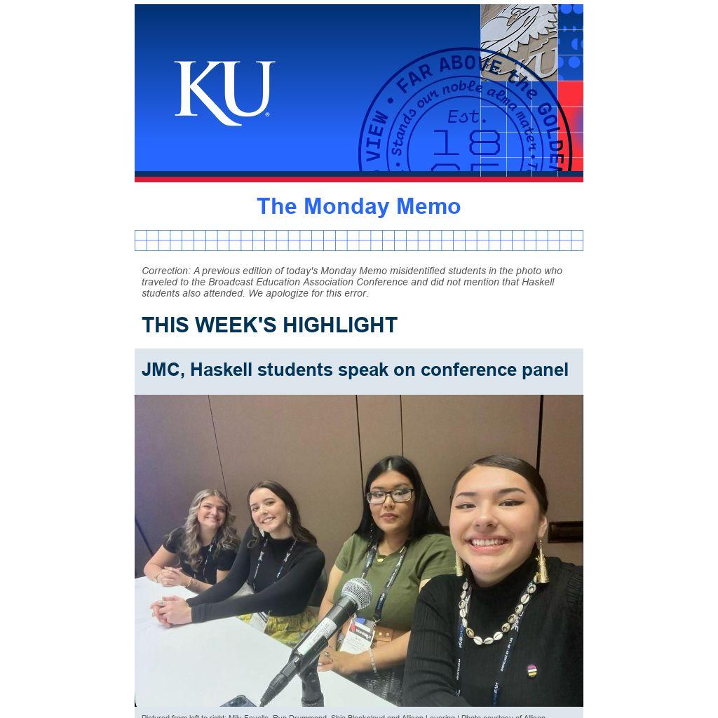 Correction: A previous edition of today's Monday Memo misidentified students in the photo who traveled to the Broadcast Education Association Conference and did not mention that Haskell students also attended. We apologize for this error.