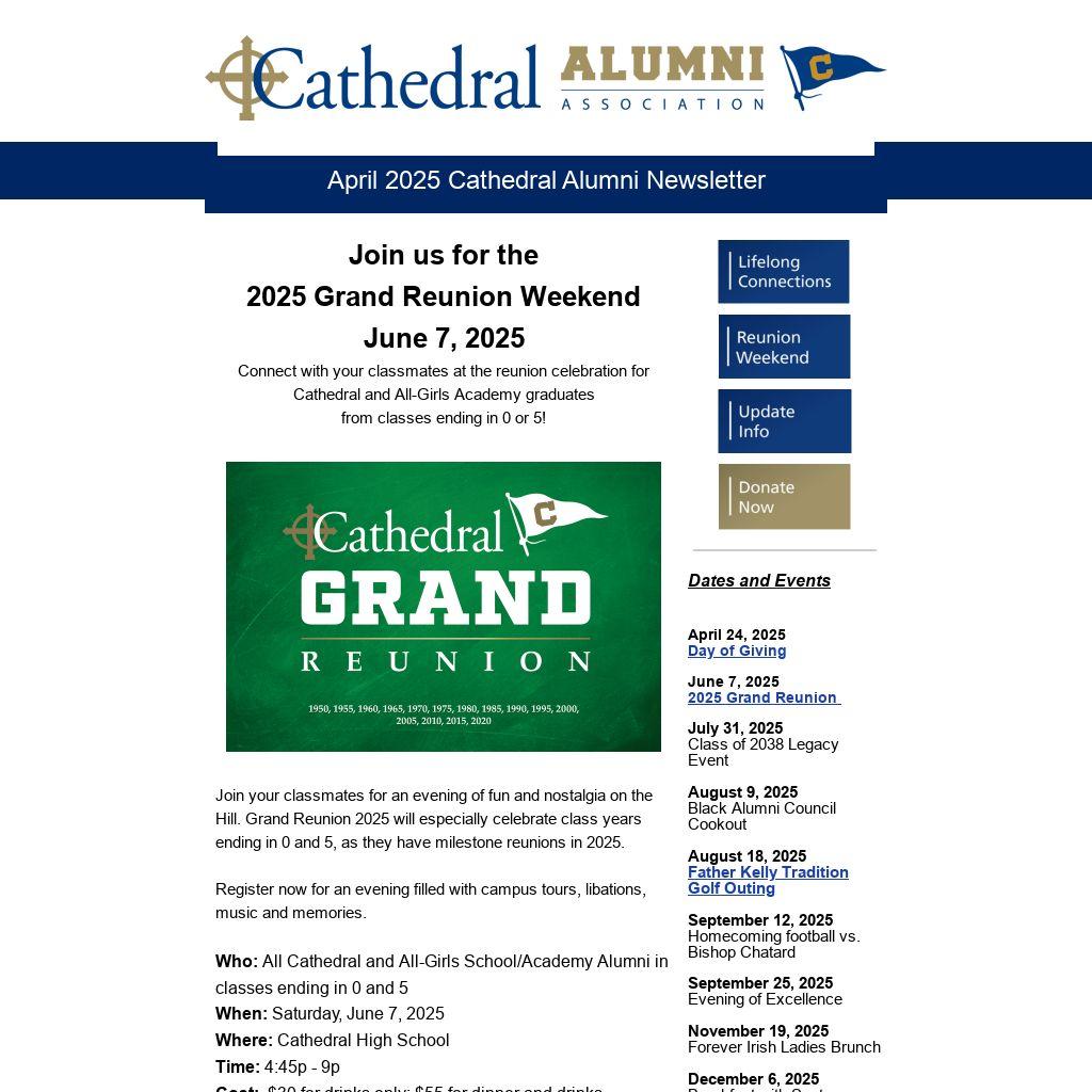 Join us for the 2025 Grand Reunion Weekend June 7, 2025Connect with your classmates at the reunion celebration for Cathedral and All-Girls Academy graduates from classes ending in 0 or 5!