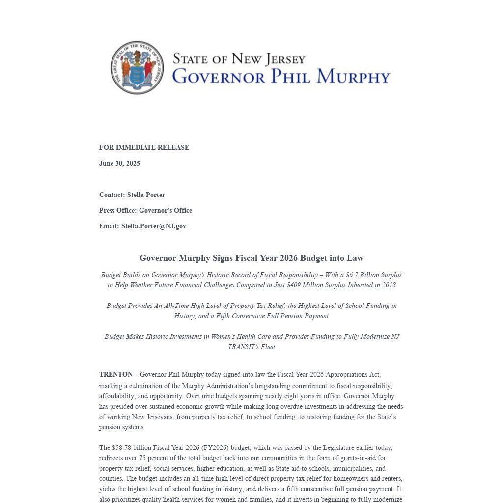 TRENTON – Governor Phil Murphy today signed into law the Fiscal Year 2026 Appropriations Act, marking a culmination of the Murphy Administration’s longstanding commitment to fiscal responsibility, affordability, and opportunity. Over nine budgets spanning nearly eight years in office, Governor Murphy has presided over sustained economic growth while making long overdue investments in addressing the needs of working New Jerseyans, from property tax relief, to school funding, to restoring funding for the State’s pension systems.