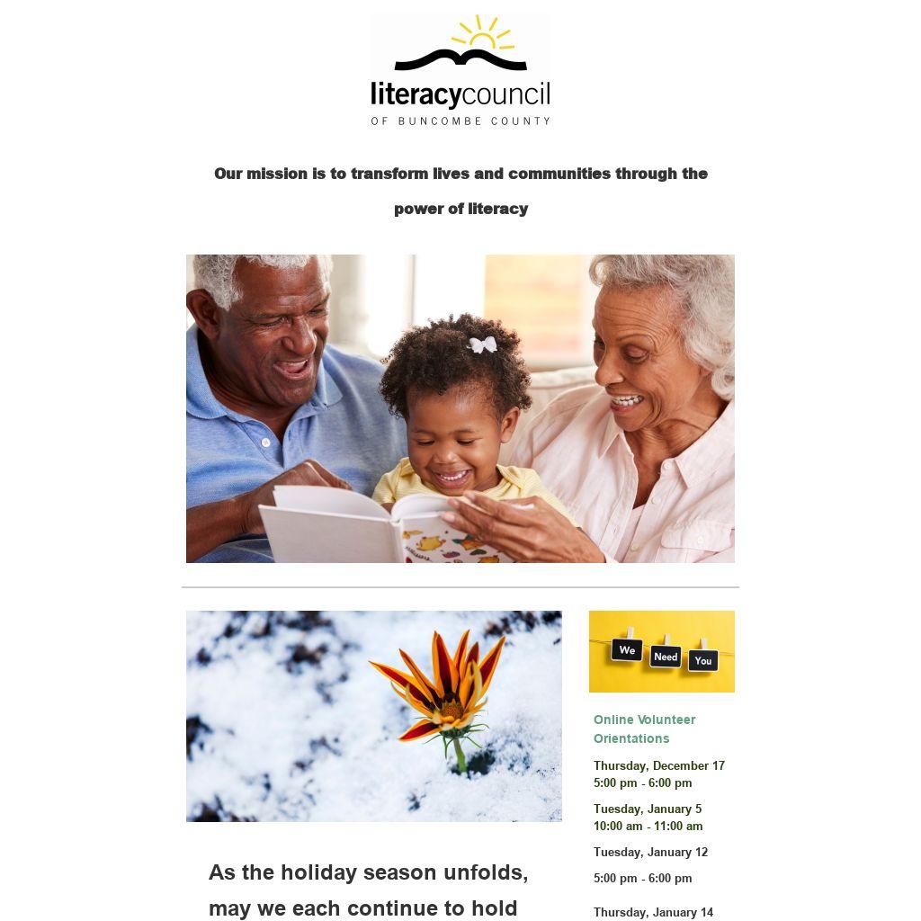 Hope for a new year filled with peace, tolerance, healing, and joy. I am humbled to be part of this dynamic team of staff, students, tutors, board, and donors. Together we create a gift that lasts throughout the year--- the life-changing gift of literacy. Thanks to each of you for your part in making it happen!