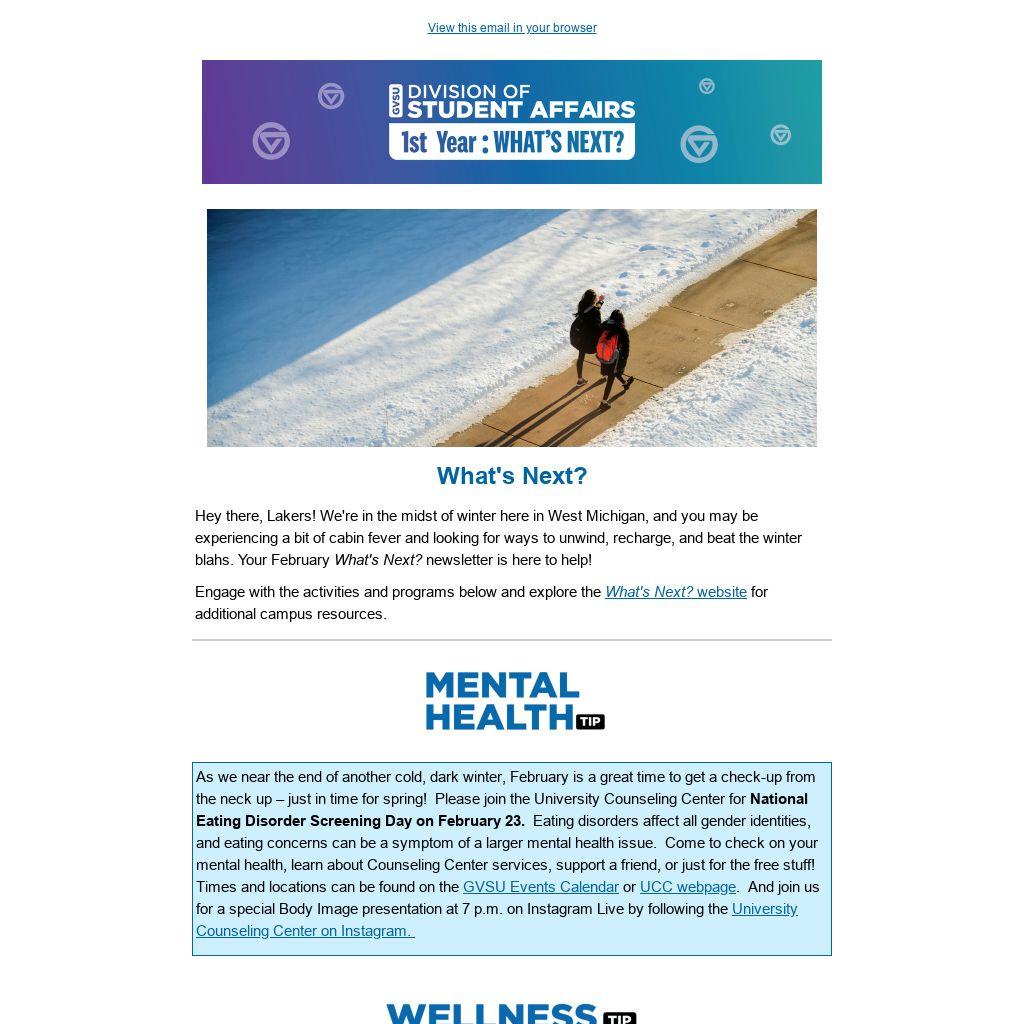 What's Next?Hey there, Lakers! We're in the midst of winter here in West Michigan, and you may be experiencing a bit of cabin fever and looking for ways to unwind, recharge, and beat the winter blahs. Your February What's Next? newsletter is here to help!