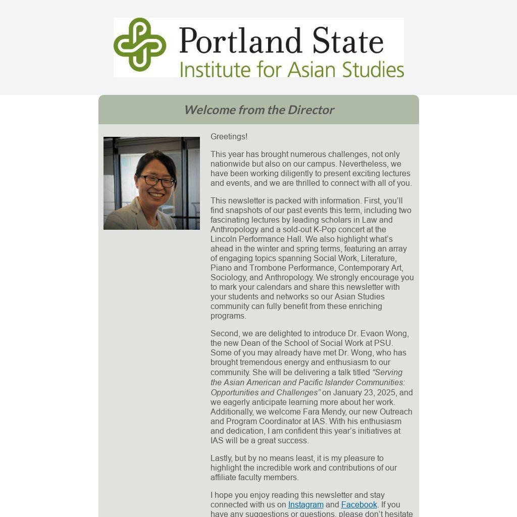 Second, we are delighted to introduce Dr. Evaon Wong, the new Dean of the School of Social Work at PSU. Some of you may already have met Dr. Wong, who has brought tremendous energy and enthusiasm to our community. She will be delivering a talk titled “Serving the Asian American and Pacific Islander Communities: Opportunities and Challenges” on January 23, 2025, and we eagerly anticipate learning more about her work. Additionally, we welcome Fara Mendy, our new Outreach and Program Coordinator at IAS. With his enthusiasm and dedication, I am confident this year’s initiatives at IAS will be a great success.