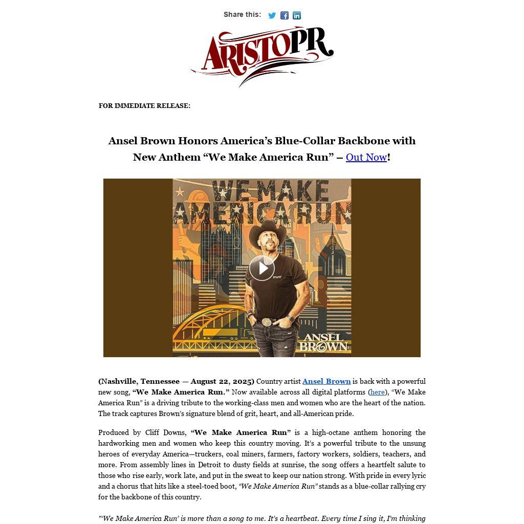 (Nashville, Tennessee — August 22, 2025) Country artist Ansel Brown is back with a powerful new song, “We Make America Run.” Now available across all digital platforms (here), “We Make America Run” is a driving tribute to the working-class men and women who are the heart of the nation. The track captures Brown’s signature blend of grit, heart, and all-American pride.
