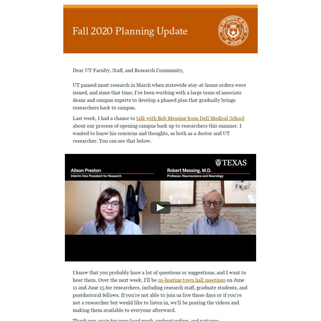 Video with Bob Messing from Dell Med about research for Fall 2020