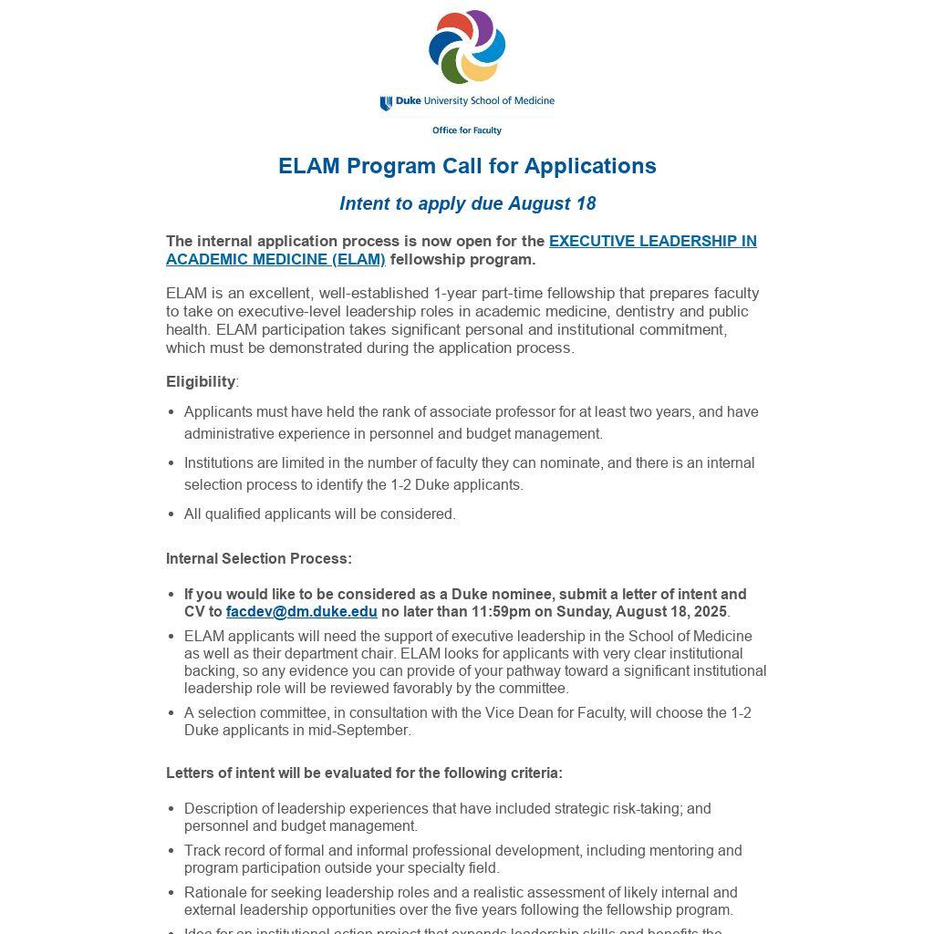 If you are selected as a Duke applicant, you will need to submit an extensive application to ELAM (due October 31), as well as letters of recommendation and nomination (due November 18). Please familiarize yourself with this process now, and tailor your Letter of Intent to the criteria described in the ELAM application process.