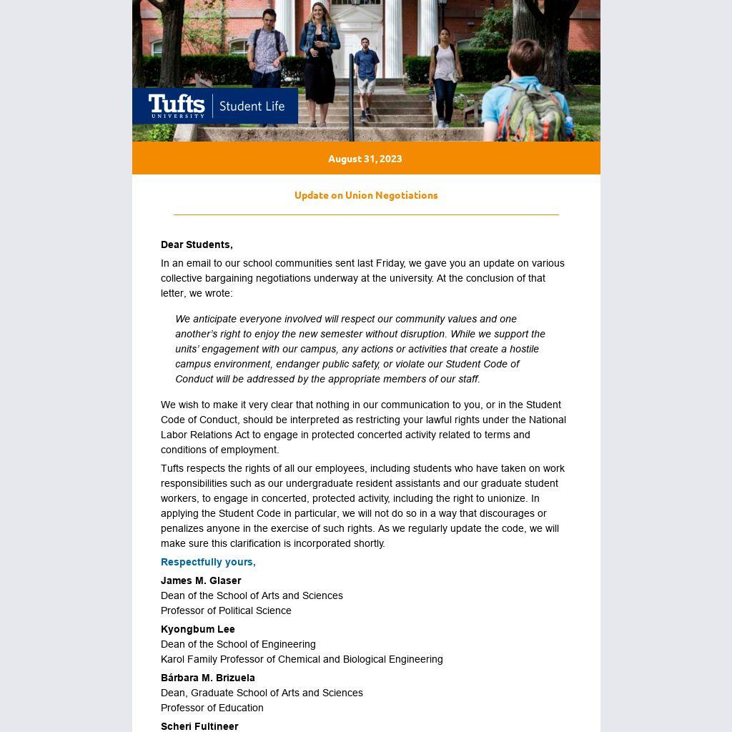 Tufts respects the rights of all our employees, including students who have taken on work responsibilities such as our undergraduate resident assistants and our graduate student workers, to engage in concerted, protected activity, including the right to unionize. In applying the Student Code in particular, we will not do so in a way that discourages or penalizes anyone in the exercise of such rights. As we regularly update the code, we will make sure this clarification is incorporated shortly.