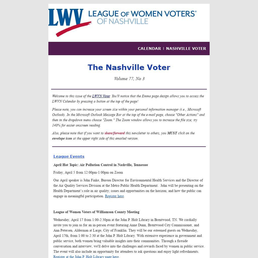 ATTENTION: The Nashville Voter is a digital publication. If you have received this copy of the Voter in the mail, it means the League of Women Voters of Nashville does not have an e-mail address for you. Please help us by sending your e-mail address to LWVNash@gmail.com. Being on the LWVN e-mail database ensures your receipt of all LWVN newsletters, event invitations, meeting announcements, and Call to Action alerts.