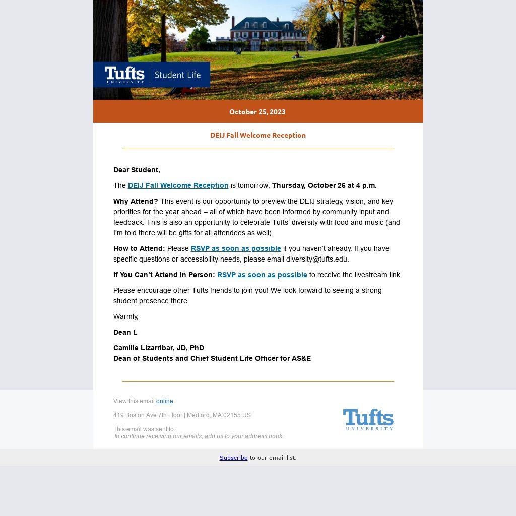 Why Attend? This event is our opportunity to preview the DEIJ strategy, vision, and key priorities for the year ahead – all of which have been informed by community input and feedback. This is also an opportunity to celebrate Tufts’ diversity with food and music (and I’m told there will be gifts for all attendees as well).