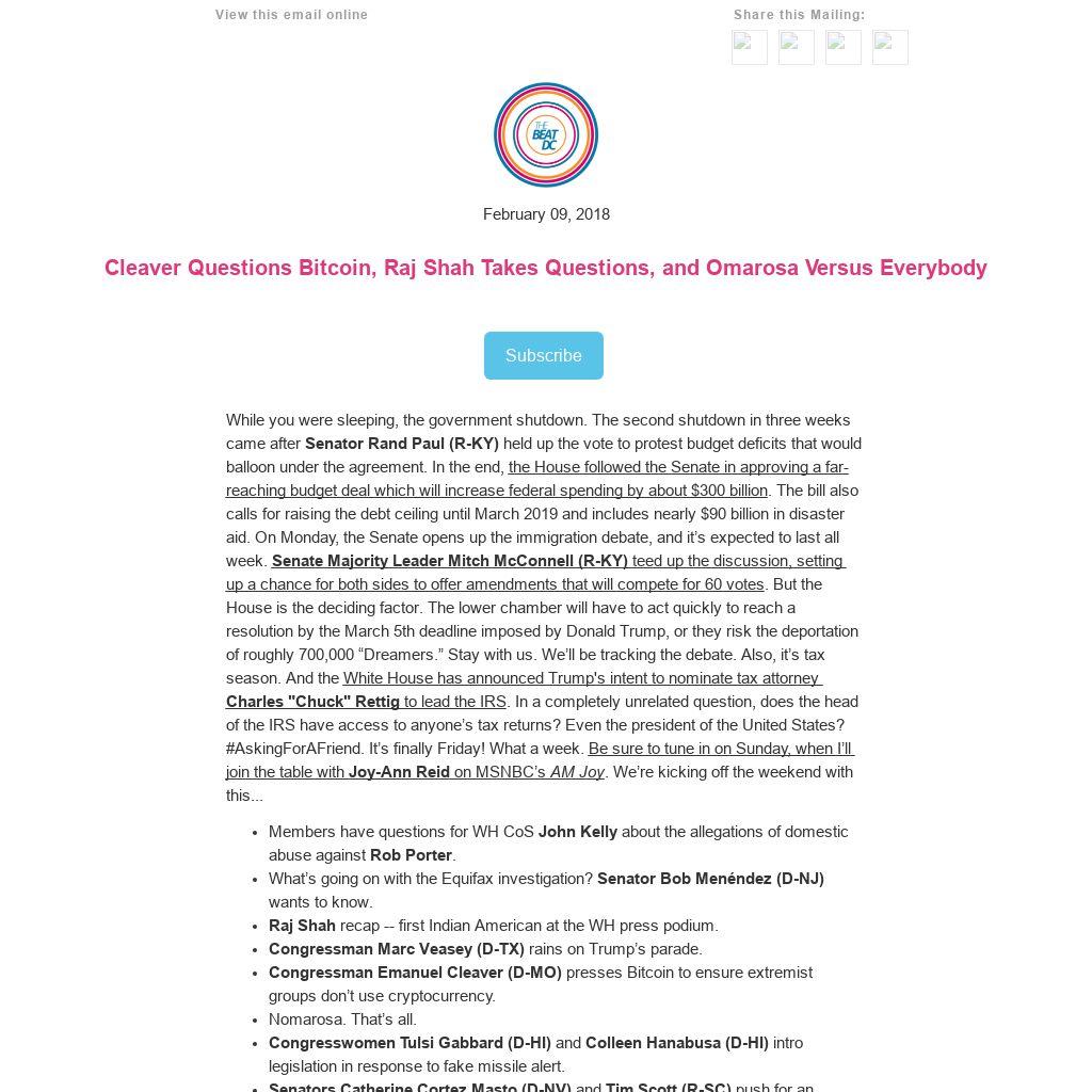 While you were sleeping, the government shutdown. The second shutdown in three weeks came after Senator Rand Paul (R-KY) held up the vote to protest budget deficits that would balloon under the agreement. In the end, the House followed the Senate in approving a far-reaching budget deal which will increase federal spending by about $300 billion. The bill also calls for raising the debt ceiling until March 2019 and includes nearly $90 billion in disaster aid. On Monday, the Senate opens up the immigration debate, and it’s expected to last all week. Senate Majority Leader Mitch McConnell (R-KY) teed up the discussion, setting up a chance for both sides to offer amendments that will compete for 60 votes. But the House is the deciding factor. The lower chamber will have to act quickly to reach a resolution by the March 5th deadline imposed by Donald Trump, or they risk the deportation of roughly 700,000 “Dreamers.” Stay with us. We’ll be tracking the debate. Also, it’s tax season. And the White House has announced Trump's intent to nominate tax attorney Charles "Chuck" Rettig to lead the IRS. In a completely unrelated question, does the head of the IRS have access to anyone’s tax returns? Even the president of the United States? #AskingForAFriend. It’s finally Friday! What a week. Be sure to tune in on Sunday, when I’ll join the table with Joy-Ann Reid on MSNBC’s AM Joy. We’re kicking off the weekend with this...