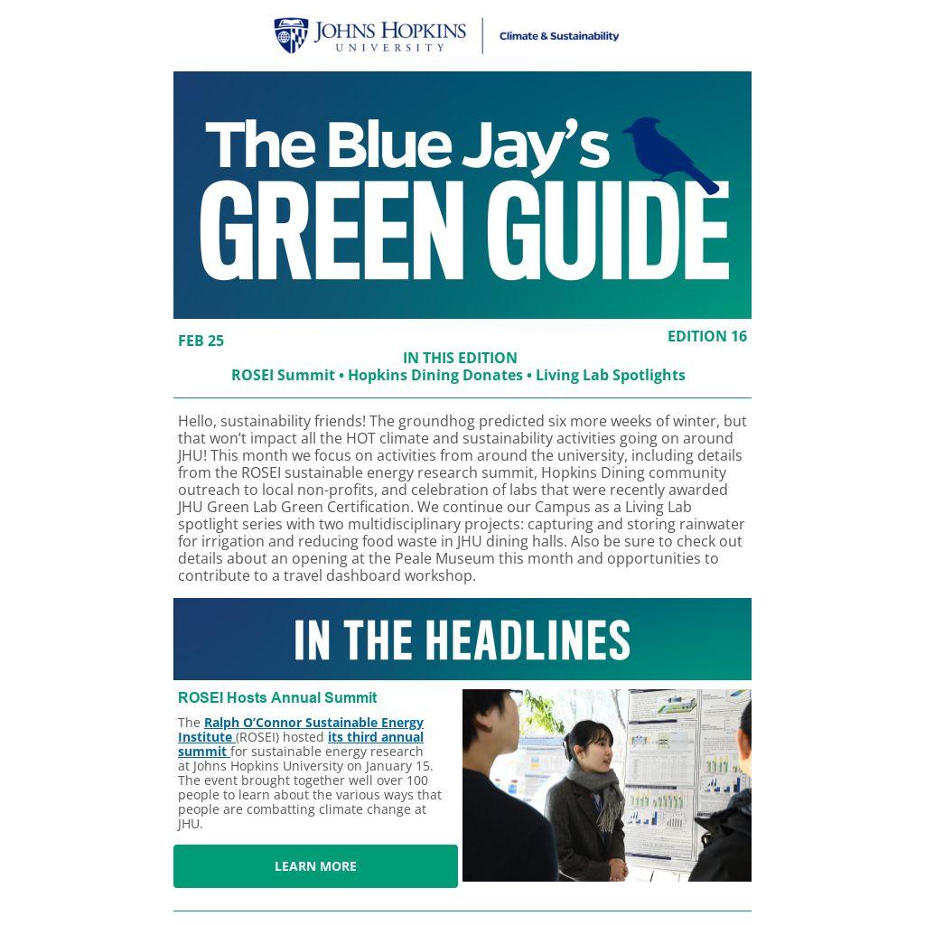 Hello, sustainability friends! The groundhog predicted six more weeks of winter, but that won’t impact all the HOT climate and sustainability activities going on around JHU! This month we focus on activities from around the university, including details from the ROSEI sustainable energy research summit, Hopkins Dining community outreach to local non-profits, and celebration of labs that were recently awarded JHU Green Lab Green Certification. We continue our Campus as a Living Lab spotlight series with two multidisciplinary projects: capturing and storing rainwater for irrigation and reducing food waste in JHU dining halls. Also be sure to check out details about an opening at the Peale Museum this month and opportunities to contribute to a travel dashboard workshop.