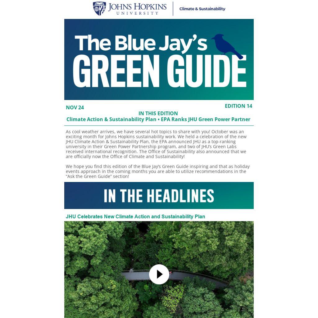 As cool weather arrives, we have several hot topics to share with you! October was an exciting month for Johns Hopkins sustainability work. We held a celebration of the new JHU Climate Action & Sustainability Plan, the EPA announced JHU as a top-ranking university in their Green Power Partnership program, and two of JHU’s Green Labs received international recognition. The Office of Sustainability also announced that we are officially now the Office of Climate and Sustainability!