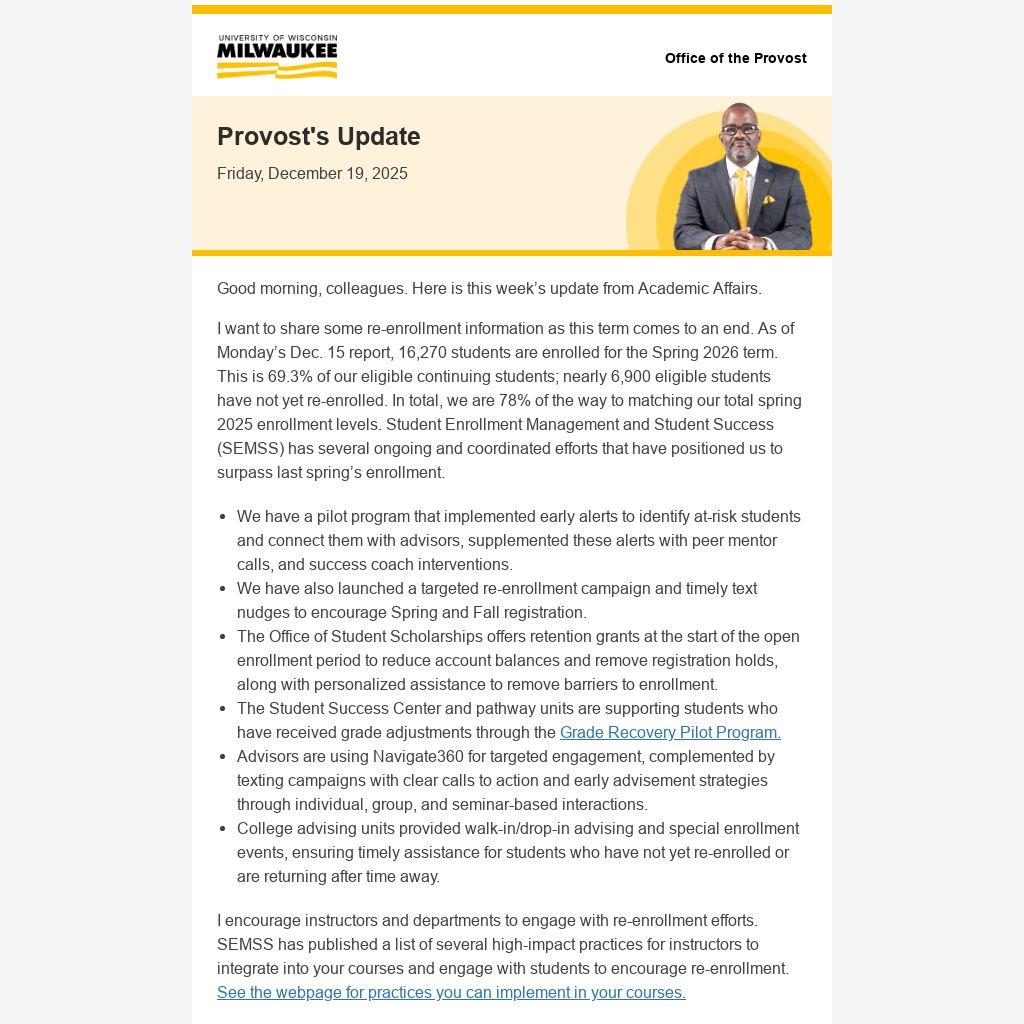 I want to share some re-enrollment information as this term comes to an end. As of Monday’s Dec. 15 report, 16,270 students are enrolled for the Spring 2026 term. This is 69.3% of our eligible continuing students; nearly 6,900 eligible students have not yet re-enrolled. In total, we are 78% of the way to matching our total spring 2025 enrollment levels. Student Enrollment Management and Student Success (SEMSS) has several ongoing and coordinated efforts that have positioned us to surpass last spring’s enrollment.