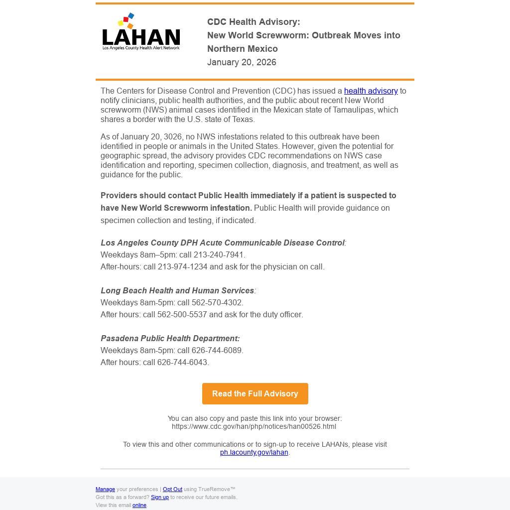 Providers should contact Public Health immediately if a patient is suspected to have New World Screwworm infestation. Public Health will provide guidance on specimen collection and testing, if indicated.