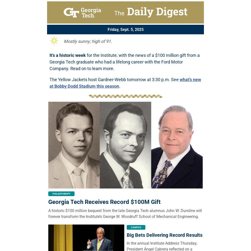 It’s a historic week for the Institute, with the news of a $100 million gift from a Georgia Tech graduate who had a lifelong career with the Ford Motor Company. Read on to learn more.
