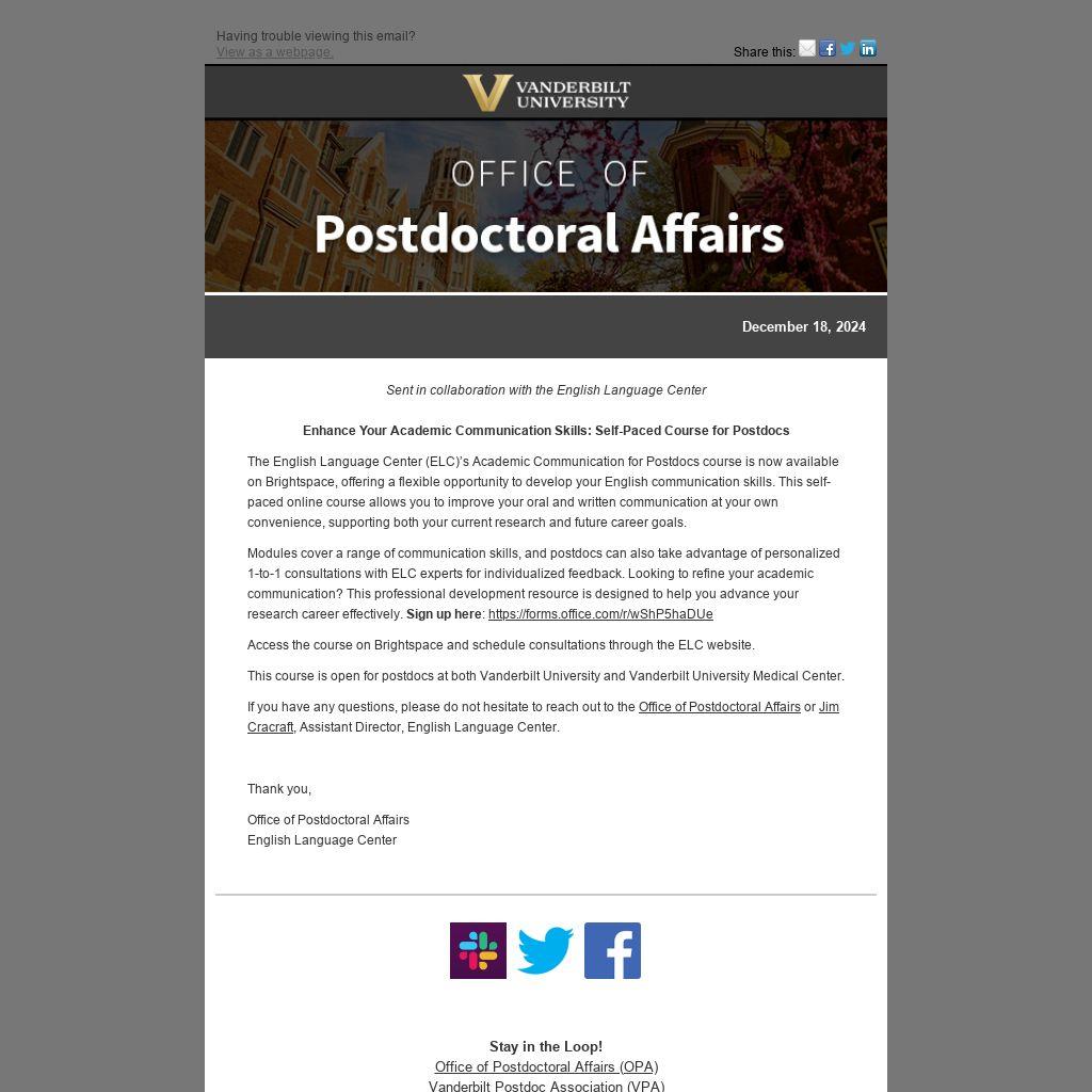 Modules cover a range of communication skills, and postdocs can also take advantage of personalized 1-to-1 consultations with ELC experts for individualized feedback. Looking to refine your academic communication? This professional development resource is designed to help you advance your research career effectively. Sign up here: https://forms.office.com/r/wShP5haDUe