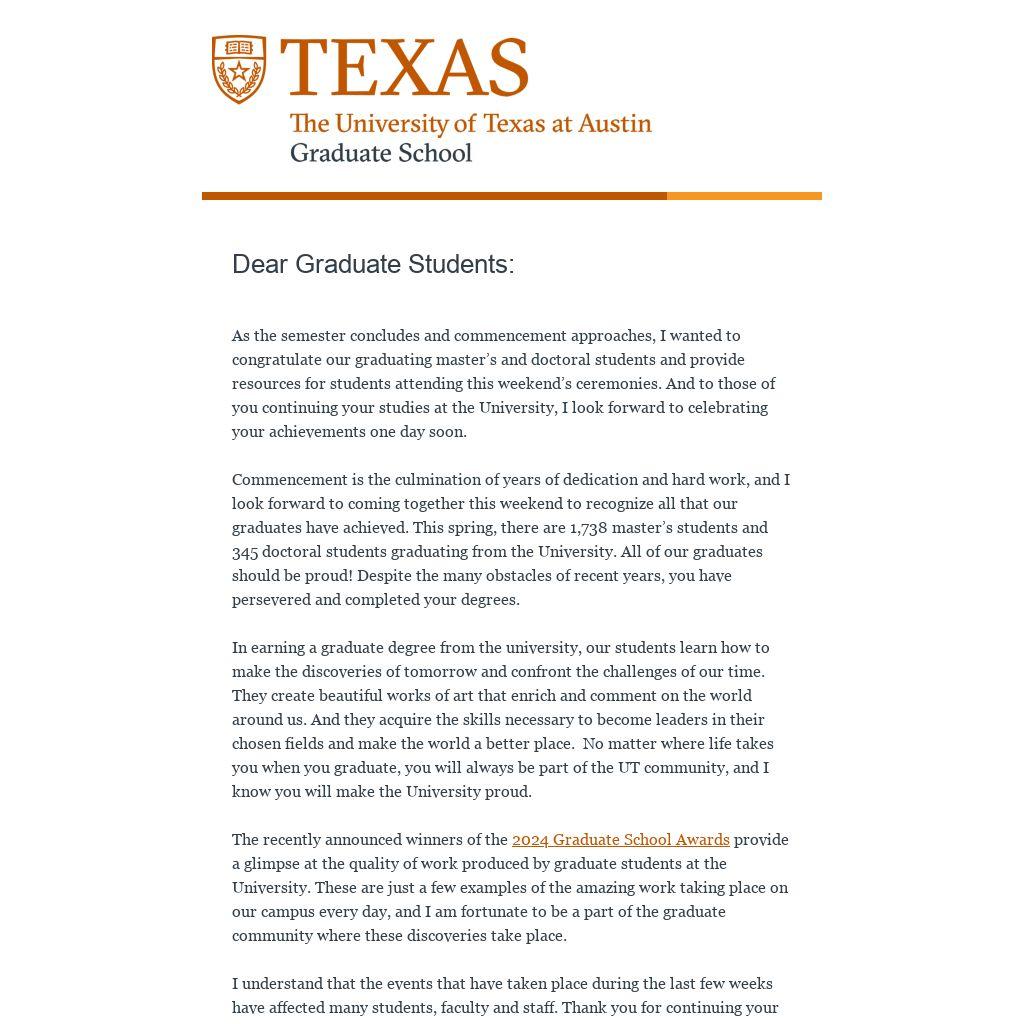 As the semester concludes and commencement approaches, I wanted to congratulate our graduating master’s and doctoral students and provide resources for students attending this weekend’s ceremonies. And to those of you continuing your studies at the University, I look forward to celebrating your achievements one day soon.