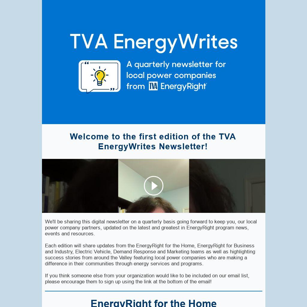 Welcome to the first edition of the TVA EnergyWrites Newsletter!